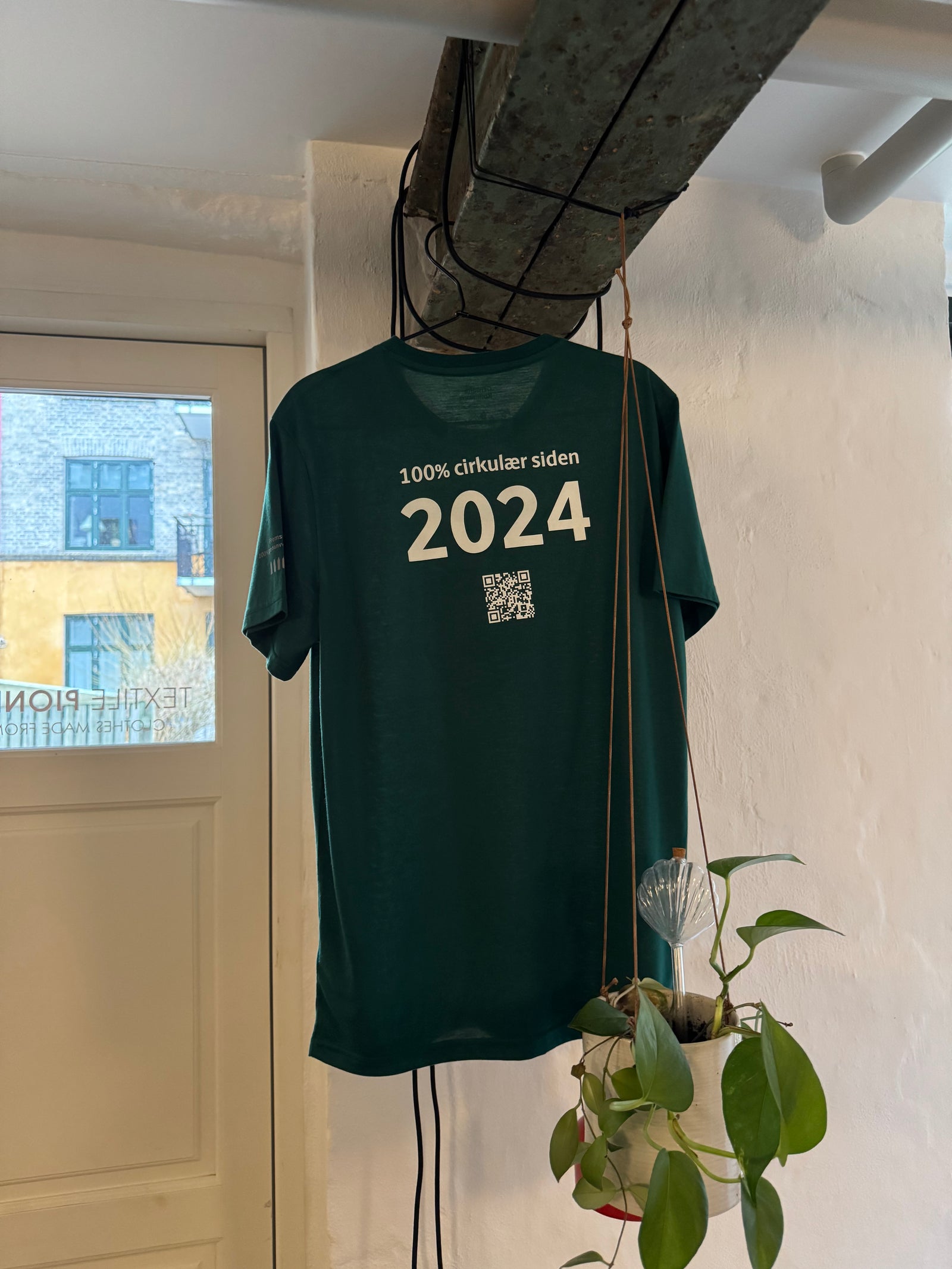 T-shirten er fremstillet af 100% genanvendt polyester, der svarer til ca. 7 engangsflasker pr. stk. – et materiale valgt for at udnytte eksisterende ressourcer i stedet for at bruge nye.